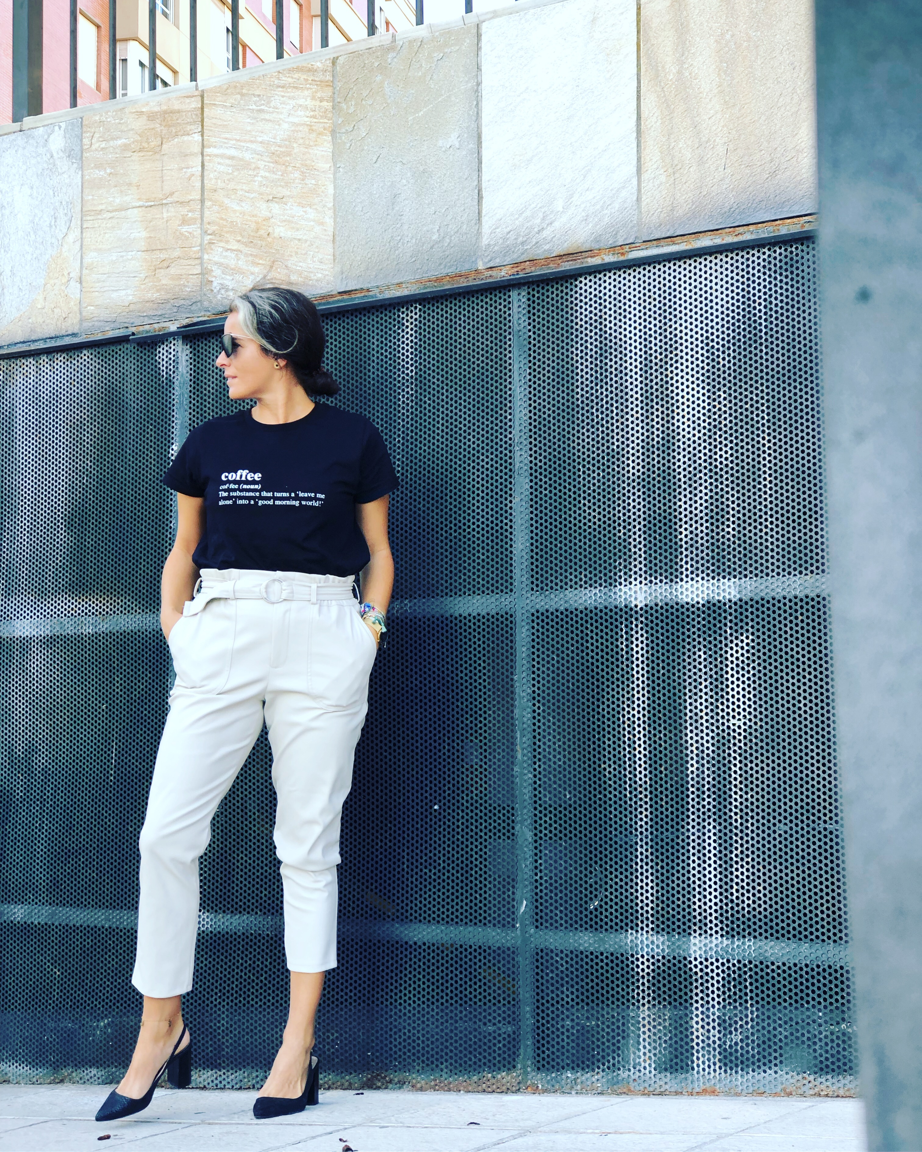 Pantalón combinado con camiseta básica negra con frase (tendencias) @primark,