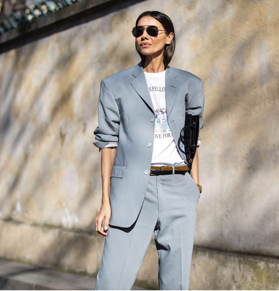 Mi Traje de Chaqueta es de mi tienda, chaqueta sin botones oversize con manga al codo y pantalón «paper bag» . Lo que más me gusta es el corte del pantalón,que puedo combinar con tacones y zapatillas deportivas o sandalias.